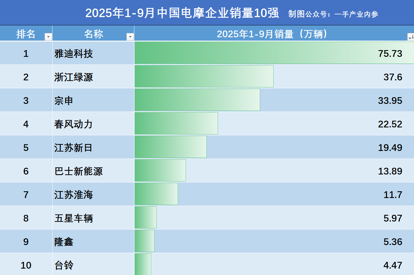 另附:2025年1-9月中国电摩销量10强厂商,数据源于:中国摩托车商会