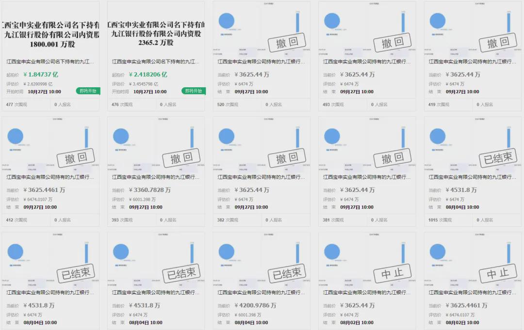 江西宝申实业有限公司所持九江银行的这笔股权并非首次现身公开拍卖。2021年6月,这笔股权被拆分成7份进行首次拍卖,评估单价以九江银行每股净资产确定为10.79元,以每股7.55元起拍,因无人出价而流拍;同年7月,这笔股权再次上架进行第二次拍卖,因申请执行人申请且被执行人同意,拍卖中止;9月,这笔股份第三次被挂出,因据以执行的生效法律文书被撤销,拍卖被撤回;2025年9月,这笔股份第四次上架,被拆分成两份即将进行公开拍卖。