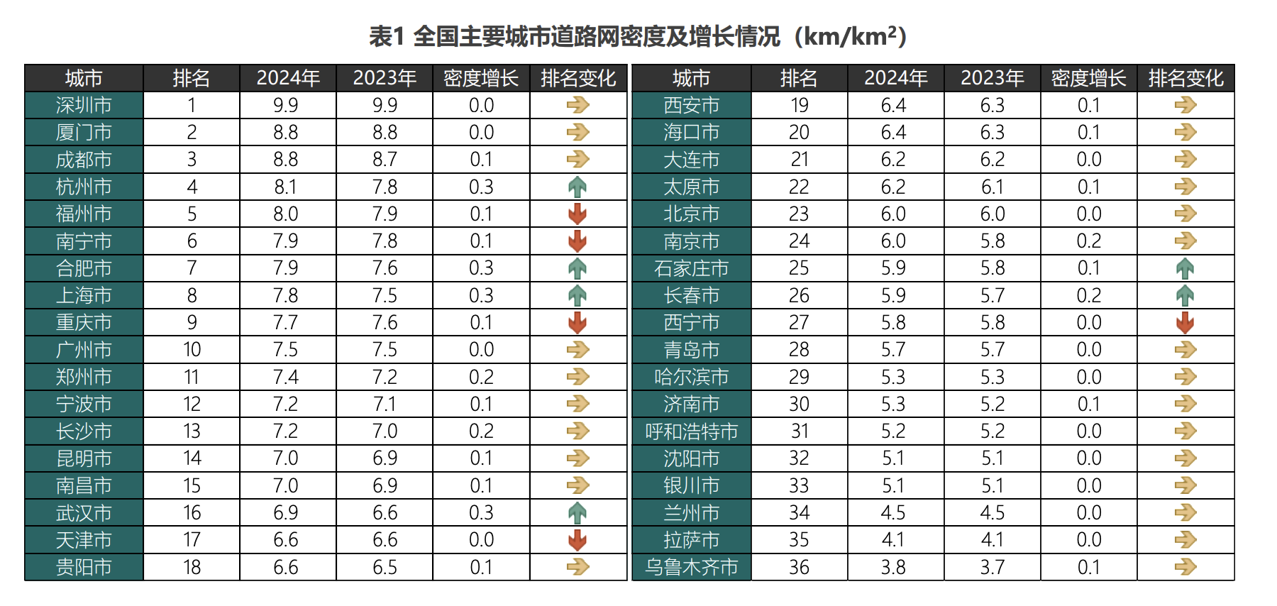 从当前达标情况来看,截至2024年第四季度,我国道路网密度达到8km/km²标准的城市有5个,分别是深圳、厦门、成都、杭州和福州,均地处南方地区。