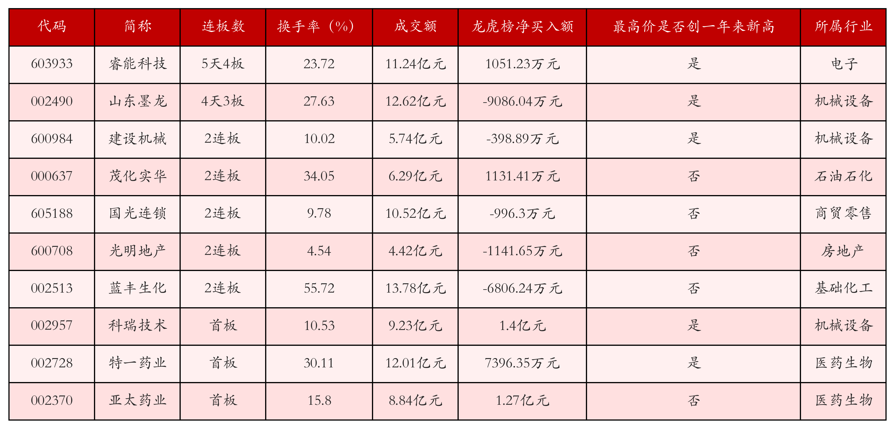 截至10月22日收盘,上证综指下跌0.07%,收于3913.76点,深证成指下跌0.62%,收于12996.61点,创业板指下跌0.79%,收于3059.32点。今日沪深两市A股共计74只涨停,综合当前连板数以及当日龙虎榜数据,其中较为强势的前三只个股分别为:睿能科技(603933)、山东墨龙(002490)与建设机械(600984)。今日强势个股前10位具体数据见下表: