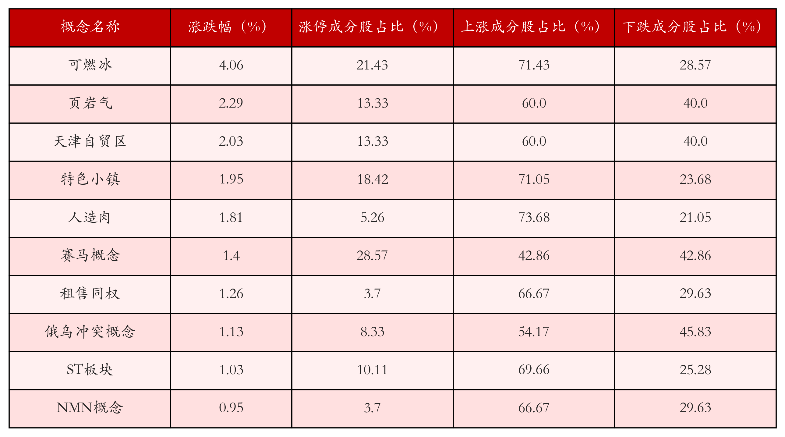 根据A股概念涨跌幅与所对应的股票池综合分析,涨幅靠前的三个概念板块分别为:可燃冰、页岩气与天津自贸区。排名前10位的概念板块相关数据见下表:
