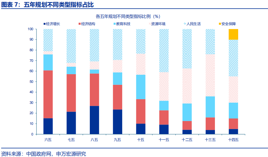 重视经济总量增速的同时,“人民至上”、“更公平”、“强化底线思维”等会议表述或指向民生福祉、安全保障等或仍是“十五五”规划重点内容。“十四五”规划,锚定2035年基本建成社会主义现代化强国这一长期规划,将其置于五年目标之前,再分领域部署中期目标。安全保障领域在“十四五”规划中新增专门设定,与经济发展、创新驱动、民生福祉、生态环保并行。其中,民生福祉类指标数共七个、占比超过三分之一,为历次五年规划中占比最高。