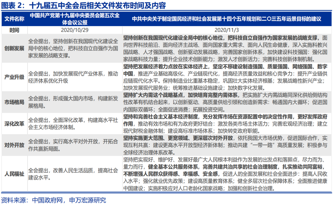 同时,本次9月中央政治局会议决定,二十届四中全会于10月20日至23日在北京召开。届时四中全会公报及后续公布的全文或对“十五五”规划给予更多指引。参考“十四五”规划正式落地前,十九届五中全会即审议通过了《中共中央关于制定国民经济和社会发展第十四个五年规划和二〇三五年远景目标的建议》(以下简称建议稿)。十九届五中全会结束当天,会议公报披露建议稿主要内容;四天后,建议稿原文发布,进一步阐释五年规划建议相关细节。