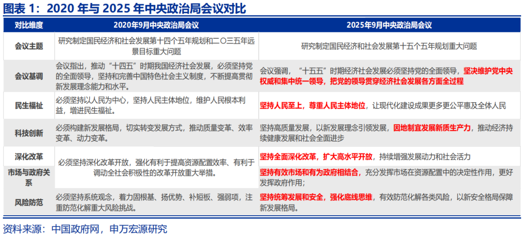 本次9月中央政治局会议正值新一轮五年规划落地前,会议主题为研究制定国民经济和社会发展第十五个五年规划重大问题。与“十四五”规划落地前的2020年9月的政治局会议相比,本次会议更突出“人民“与“公平”、“因地制宜发展”、“扩大高水平开放”、“坚持有效市场和有为政府相结合”、“强化底线思维”等核心导向。