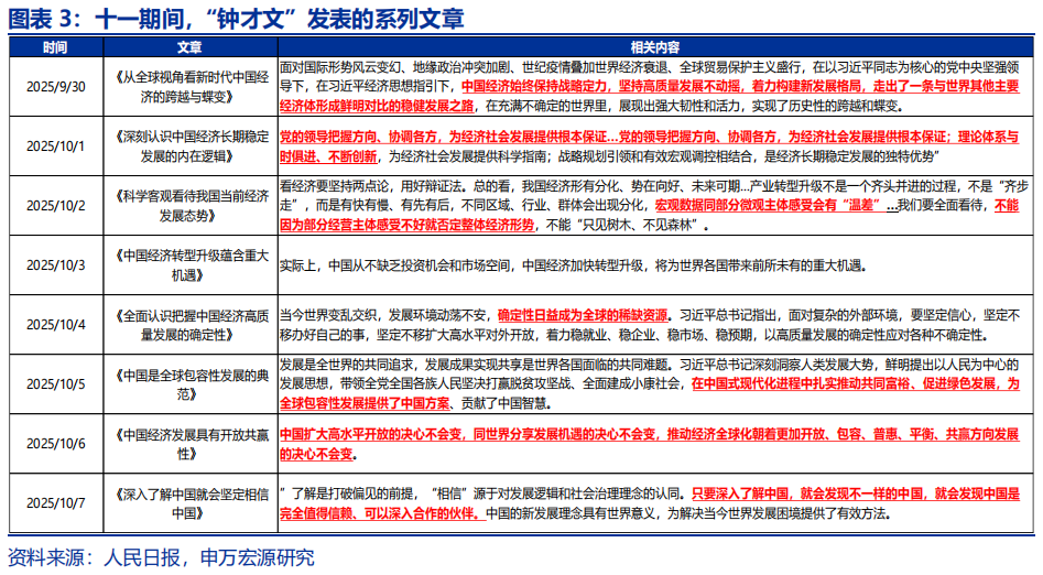 政治局会议后,人民日报连续推出8篇署名“钟才文”的系列文章,亦对新一轮五年规划有所指引。“钟才文”文为中央财经委员会发表重要专论的署名。系列文章发布于四中全会召开前,围绕“经济形势怎么看经济工作怎么干” 从全球视角切入,深入中国经济的内在逻辑,客观分析短期与长期经济发展态势。文章提出的“产业转型升级不是‘齐步走’,宏观数据同部分微观主体感受会有‘温差’,要通过改革与政策给力,着力缩小‘温差’…中国经济加快转型升级,将为世界各国带来前所未有的重大机遇”或意味着新的五年规划中经济产业转型、政策加码、改革支持或是重点。