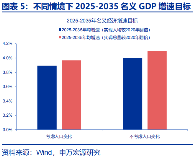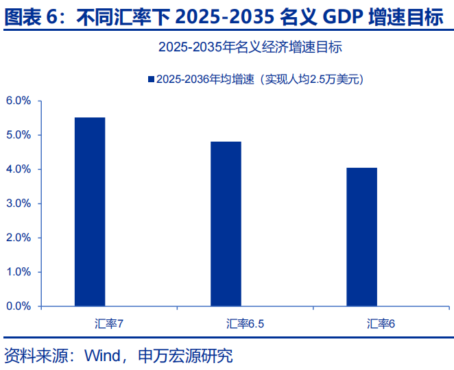 即便“十四五”规划中已淡化经济总量增长目标、重视经济结构发展,但为实现社会主义现代化建设目标,或仍对“十五五”期间经济增速有一定要求。长期目标看,为了实现2035年社会主义现代化目标,我国经济总量/人均国内生产总值比2020年翻一番,“十五五”和“十六五”阶段,我国或需至少保持年均4.4%左右的经济增长水平(名义GDP增速4%左右)。若2035年我国人均GDP要达到2.5万美元水平(中等发达国家水平下沿),“十五五”和“十六五”阶段名义GDP增速或至少在4.1-5.5%左右(假设人民币兑美元中间价在6-7元)。