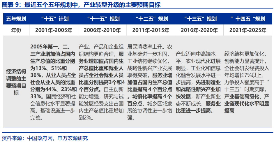 从五年规划的目标设定与实施逻辑来看,产业转型升级不仅是五年规划的重要组成部分,更是实现规划核心目标的“关键手段”。五年规划中,总量目标是核心,而经济结构调整目标则是实现总量目标的路径,即通过发展何种产业来推动经济增长。从“十五”计划到“十三五”规划,三次产业的比例会有预期目标。“十三五”规划起,政策更注重先进制造业发展;“十四五”规划,细化了研发经费投入、创新等目标。