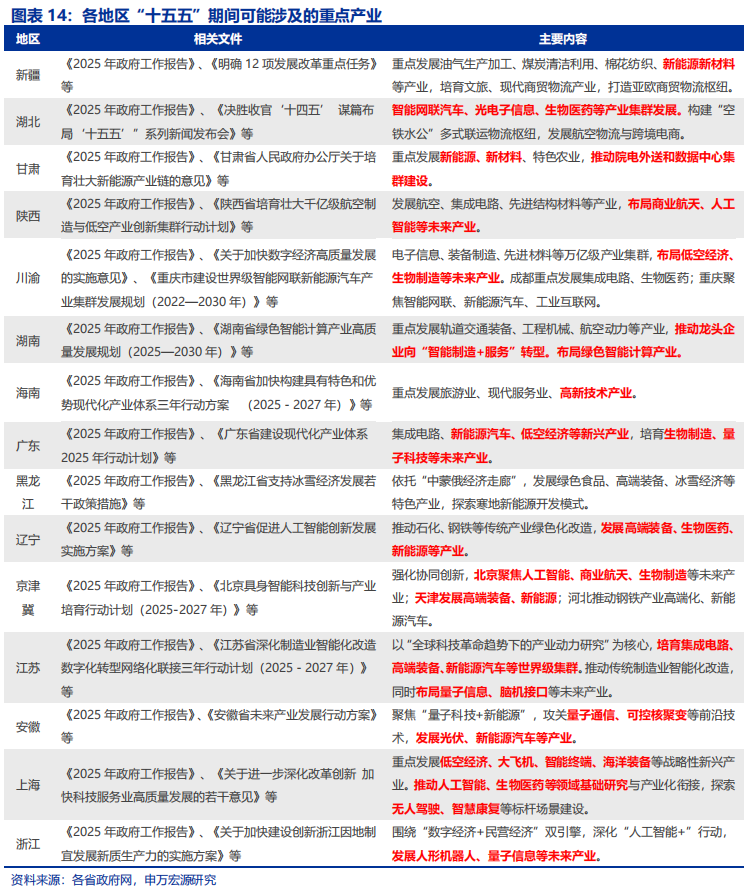 “十五五”产业规划中,“新质生产力”培育或仍是重点。从政策跟踪情况来看,“十五五”规划中的“新兴支柱产业”或将延续“十四五”规划的框架。2025年4月的政治局会议首次提出“打造一批新兴支柱产业”,7月的政治局会议则进一步强调“加快培育具有国际竞争力的新兴支柱产业”。此外,三中全会明确提出要“健全因地制宜发展新质生产力体制机制”“健全促进实体经济和数字经济深度融合制度”。