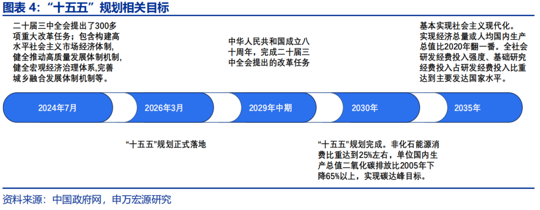 2)高质量发展、制度改革、产业转型升级或是新“五年规划”的三大主线。即便“十四五”规划已淡化经济总量目标、重视结构发展,但实现社会主义现代化建设目标,或仍对“十五五”经济增速有一定要求。二十届三中全会部署的300多项改革任务要求2029年前完成,或指向未来五年亦是进一步全面深化改革的关键时期。从五年规划的目标设定与实施逻辑来看,产业转型升级不仅是五年规划的重要组成部分,更是实现规划核心目标的“关键手段”。