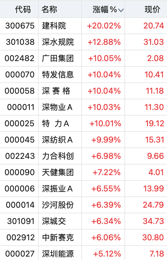 10月23日, 深圳国企改革板块开盘大涨,建科院20%涨停,深水规院涨近13%,广田集团、特发信息、深赛格、深物业A等均涨停。