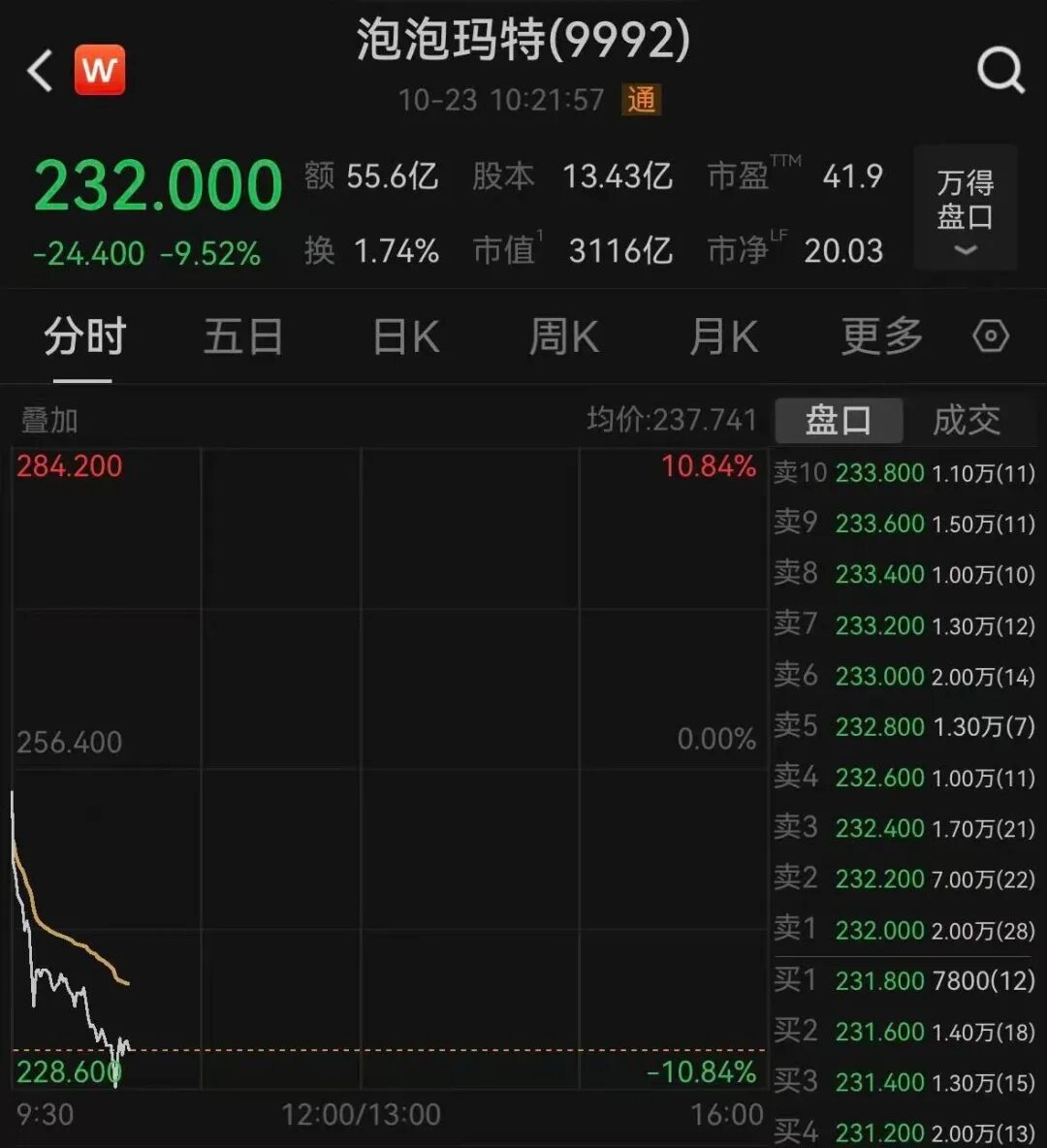 10月23日,港股新消费板块持续走低,泡泡玛特盘中一度跌近11%,截至发稿,跌9.52%,报232港元/股,最新总市值为3116亿元;此外,古茗跌超9%,蜜雪集团跌超6%。