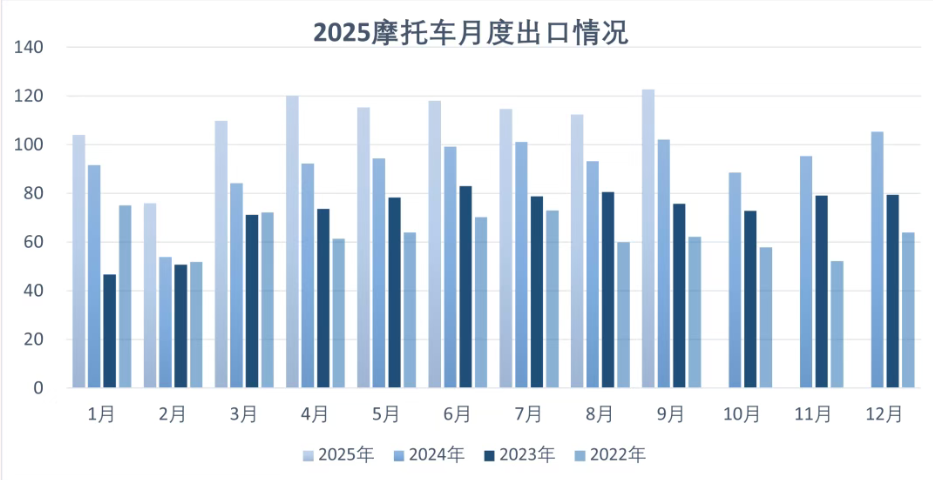 近日,中国摩托车商会发布出口数据:2025年1-9月我国摩托车出口量有996.74万辆,同比增长了22.81%,实现出口金额65.96亿美元,平均出口价格为661.75美元/辆。
