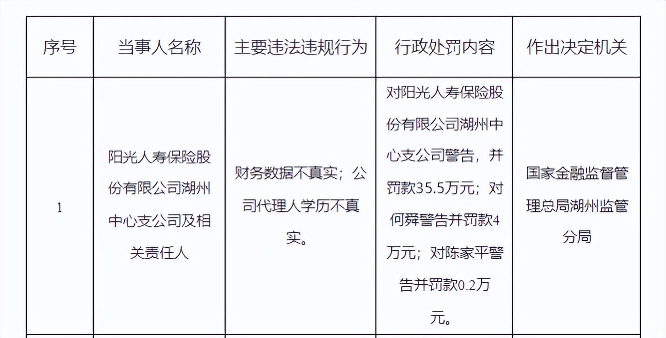 时光回溯至10月21日,阳光人寿湖州中心支公司因财务造假以及代理人学历造假等严重问题,国家金融监督管理总局湖州监管分局对阳光人寿保险股份有限公司湖州中心支公司警告,并罚款35.5万元;对何舜警告并罚款4万元;对陈家平警告并罚款0.2万元。