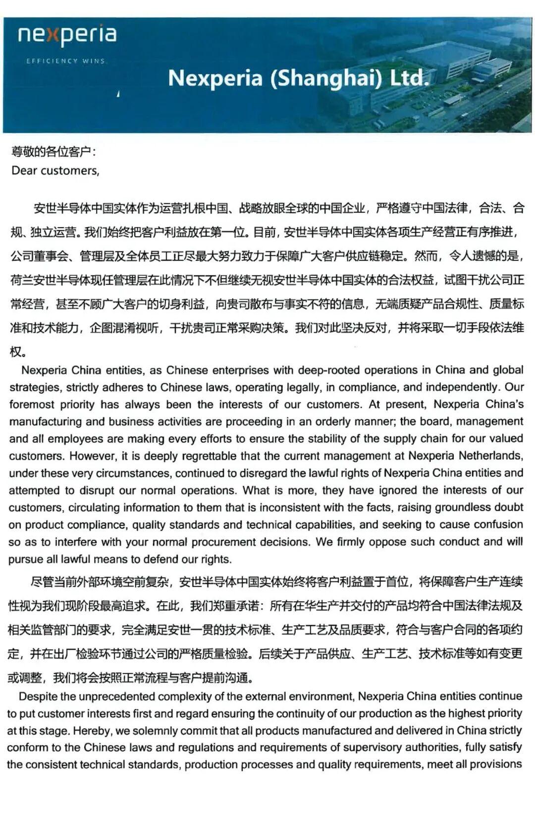 刚刚,安世半导体中国实体致信客户,称其作为中国企业合规独立运营,正保障客户供应链稳定;反对荷兰安世管理层干扰经营、散布不实信息并将依法维权,同时承诺在华产品合规达标,愿与客户紧密沟通、共护供应链稳定。