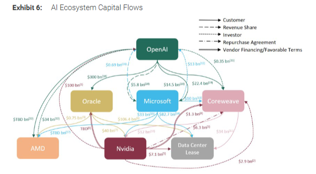 利润和执行风险:对于Coreweave和甲骨文这类靠新兴业务驱动RPO增长的公司,履行这些大规模合同所需的成本(包括基础设施、人员和维护资本支出)高度不确定。这直接影响到这些合同收入的最终回报率。客户集中度风险:AI生态系统内部的参与者关系日益交织,形成了“铁索连环”,客户与供应商之间的角色相互重叠。一个例外,英伟达的“另类”模式(AI生态系统间的资本流动情况)