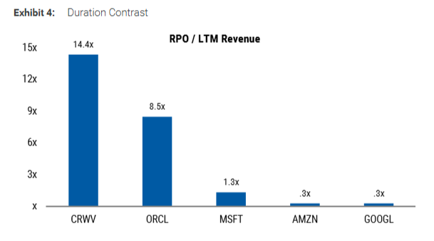 通过“RPO/过去12个月收入”这一比率,可以看出Coreweave和甲骨文的比率分别高达14.4倍和8.5倍,而微软仅为1.3倍,亚马逊和谷歌则约为0.3倍。