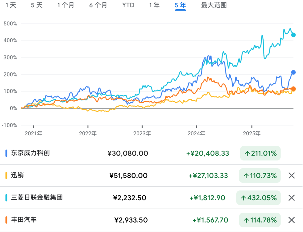 2012年后,日本央行开始大规模量化宽松(QQE),日元大幅贬值,出口企业盈利显著改善。丰田、索尼、日立等出口型公司利润暴增,成为日经225最初上涨的主要推手。日本高端制造、消费领域跑出不少10倍牛股。