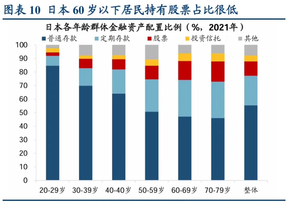 即便面对股市长年上涨,日本居民股票类金融资产占比只维持在13~14%左右的较低水平;而且持有股票占比最高的为60岁以上群体,1990年泡沫破裂之后出生的日本年轻人几乎不买股票。