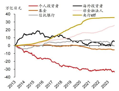 不过,日本股市的这轮十年慢牛,日本居民并不太买账;所以出现了央行用真金白银买指数ETF,居民却“用脚投票”不停卖的奇怪场面。