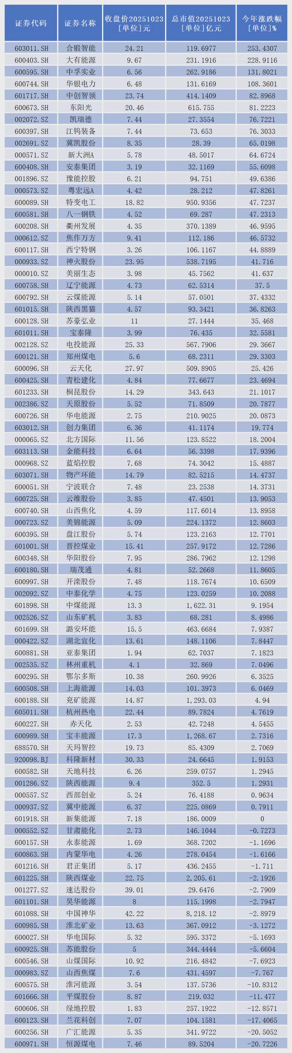 10月23日,煤炭股冲高,陕西黑猫(601015.SH)、山西焦化(600740.SH)、云煤能源(600792.SH)、上海能源(600508.SH)、郑州煤电(600121.SH)、大有能源(600403.SH)、安泰集团(600408.SH)、辽宁能源(600758.SH)等多股触及涨停。