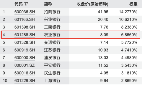 农业银行位列中证银行指数前5大成分股,权重比约6.86% 图源:Wind