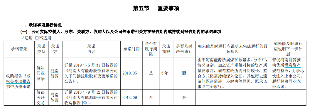 对此大有能源今年8月披露半年报时,也明确河南能源集团未能及时严格履行解决同业竞争承诺,并计划“督促河南能源推动优质煤炭资产规范整改,力争尽快注入上市公司,履行解决同业竞争承诺。”