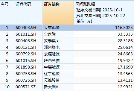 在不统计23日煤炭股“补涨”的情况下,仅统计10月初至10月22日市场表现,大有能源当月涨幅已经达到116%。