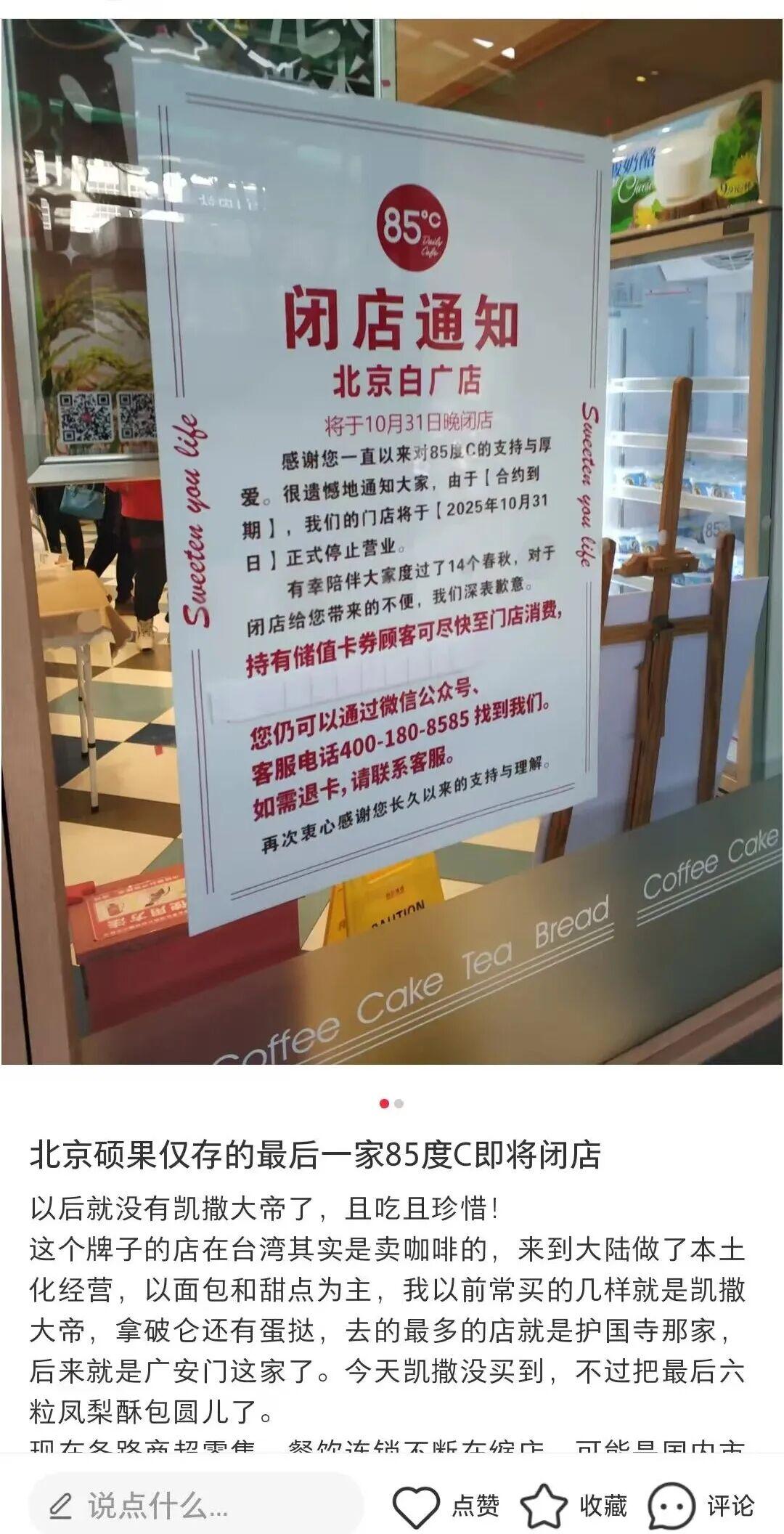 近日,有多位网友发帖称,85度C北京知春二店日前张贴出闭店通知,宣布10月19日晚闭店。