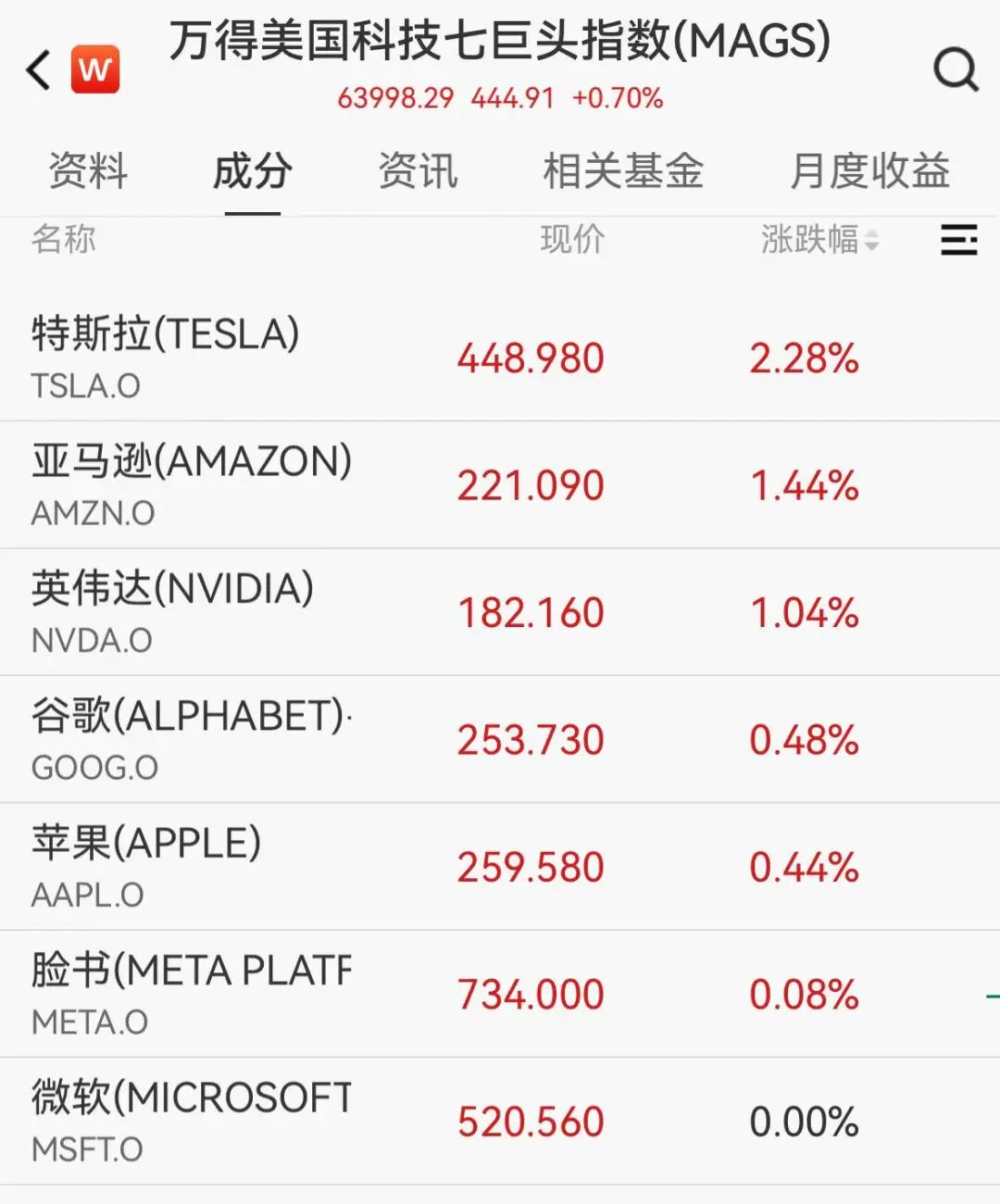 美国大型科技股普遍上涨,万得美国科技七巨头指数上涨0.70%。个股方面,特斯拉涨超2%,亚马逊、英伟达涨超1%,谷歌涨0.55%,苹果涨0.44%,脸书涨0.08%,微软持平。