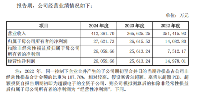 随着大数据、云计算、5G通信等新一代信息技术的发展、新能源汽车市场渗透率的提高、下游新兴产业需求的增长,公司业务呈现良好发展态势。在2022-2024年度,超颖电子营业收入分别为351415.93万元、365625.25万元和412361.70万元,业绩持续增长,盈利能力持续增强;同时公司归属于母公司所有者的净利润分别为14082.80万元、26615.53万元和27621.73万元,具备良好的持续经营能力。