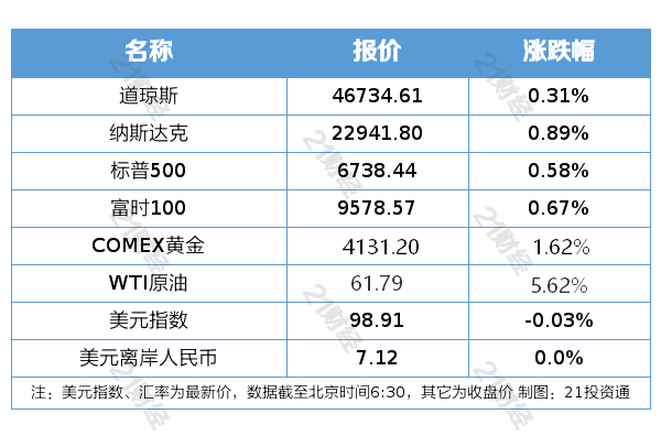 纽约股市三大股指10月23日上涨。截至当天收盘,道琼斯工业平均指数比前一交易日上涨144.20点,收于46734.61点,涨幅为0.31%;标准普尔500种股票指数上涨39.04点,收于6738.44点,涨幅为0.58%;纳斯达克综合指数上涨201.40点,收于22941.80点,涨幅为0.89%。