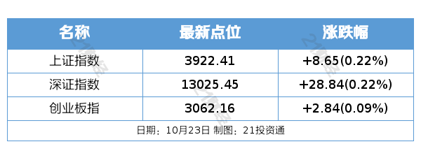 10月23日,市场探底回升,三大指数全线收红。截至收盘,沪指涨0.22%,深成指涨0.22%,创业板指涨0.09%。沪深两市成交额1.64万亿,较上一个交易日缩量239亿。