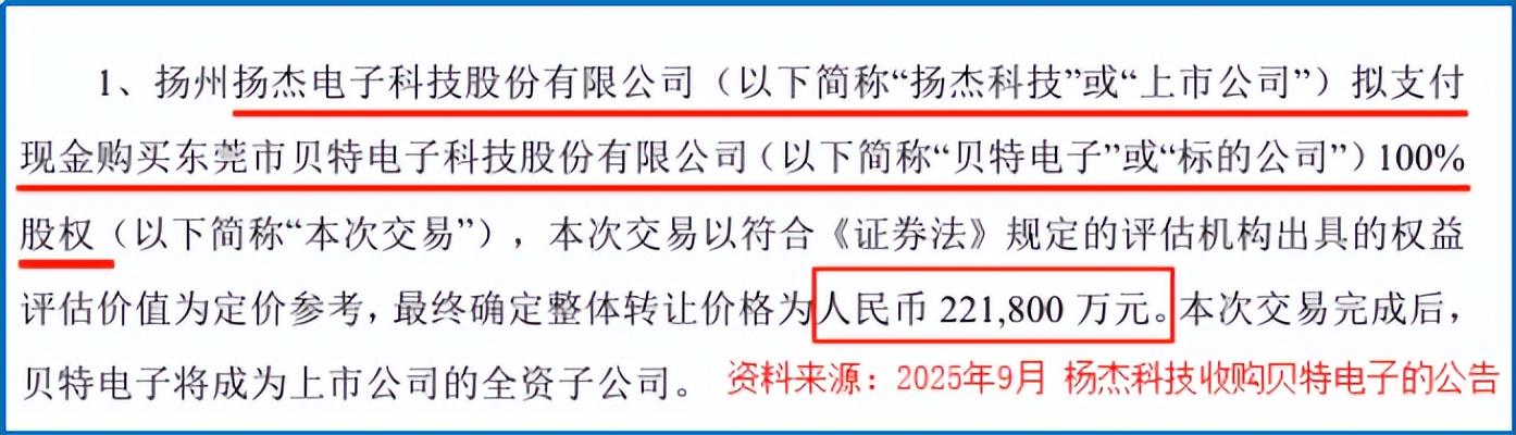 2025年9月,扬杰科技发布公告,拟以22.18亿现金将贝特电子100%股权收入囊中,成为其厉兵秣马史上的最大手笔并购。