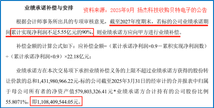 2025-2027年,贝特电子累计净利润不低于5.55亿。如果完成率低于90%(4.995亿),则需要支付最高11.08亿元的补偿。