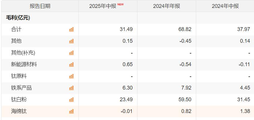 不过这两大业务也处于内卷中。海绵钛与新能源材料两项业务营收尽管均保持了增长,但盈利能力并不乐观。2024年、2025年上半年新能源业务营收分别达9.18亿元、5.27亿元,海绵钛业务分别达26.47亿元、14.9亿元。新能源业务在2024年处于亏损状态,海绵钛在2025年上半年毛利也未能盈利。