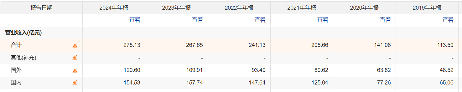 根据界面新闻统计,2019年至2024年海外营收从48.52亿元涨至120.6亿元,2020年至2024年海外营收同比增长分别为31%、26% 、16%、17.6%和9%。