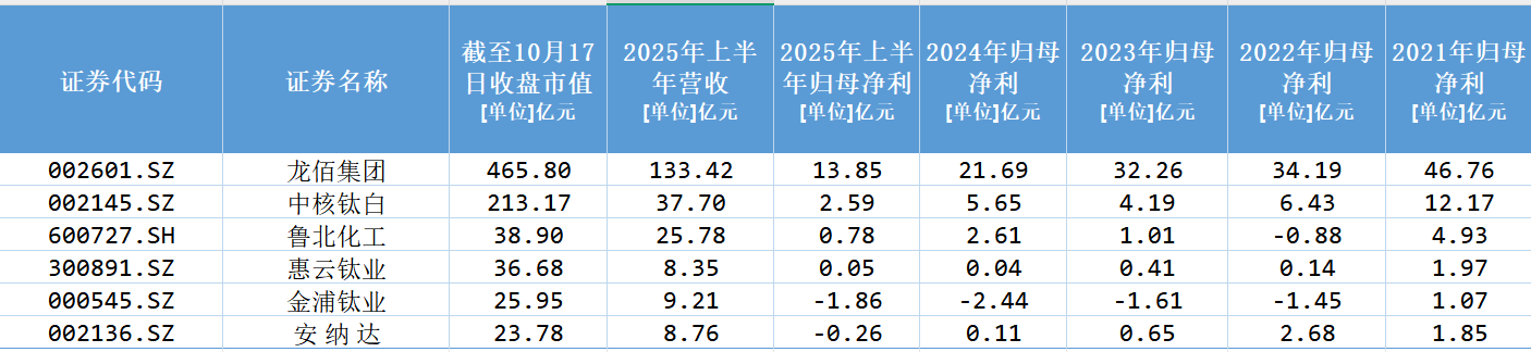 龙佰集团注册地在河南省焦作市,是钛白粉行业为数不多的同时具有硫酸法工艺和氯化法工艺的钛白粉供应商。按产能计,公司是全球最大硫酸法钛白粉生产商,全球第三大、中国第一大氯化法钛白粉生产商。 2025年上半年,龙佰集团营业收入133.31亿元,归母净利润13.85亿元。