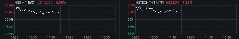 【恒生科指半日涨1.22%】截至午盘,恒生指数涨0.59%,报26122.10点;恒生科技指数涨1.22%,报6024.04点;恒生中国企业指数涨0.46%,报9343.35点。(中新经纬APP)