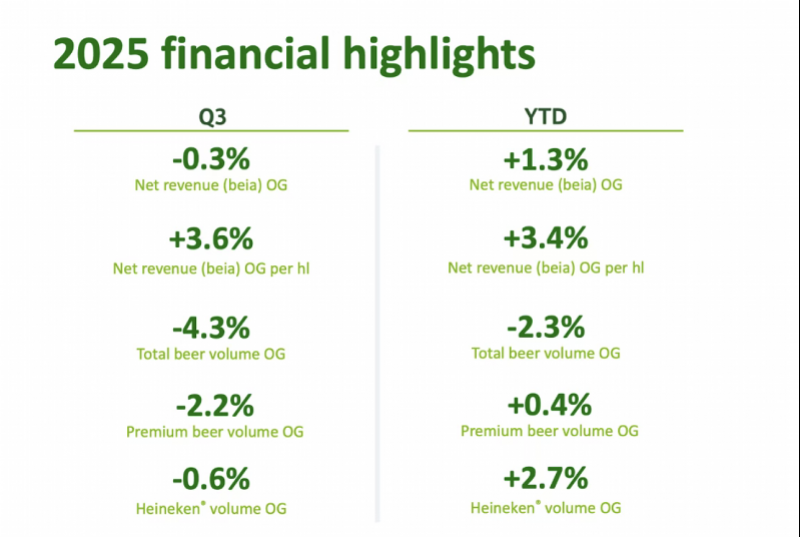 南都湾财社-酒水新消费指数课题组记者留意到,近期全球啤酒巨头喜力啤酒发布三季报。数据显示,2025年前三季度,喜力啤酒公司实现收入256.36亿欧元(折合人民币2120.96亿元),同比下降4.7%;实现净收入215.07亿欧元(折合人民币1778.99亿元),同比下降3.9%,销量方面,前三季度累计销量1754万千升,同比下降2.61%。