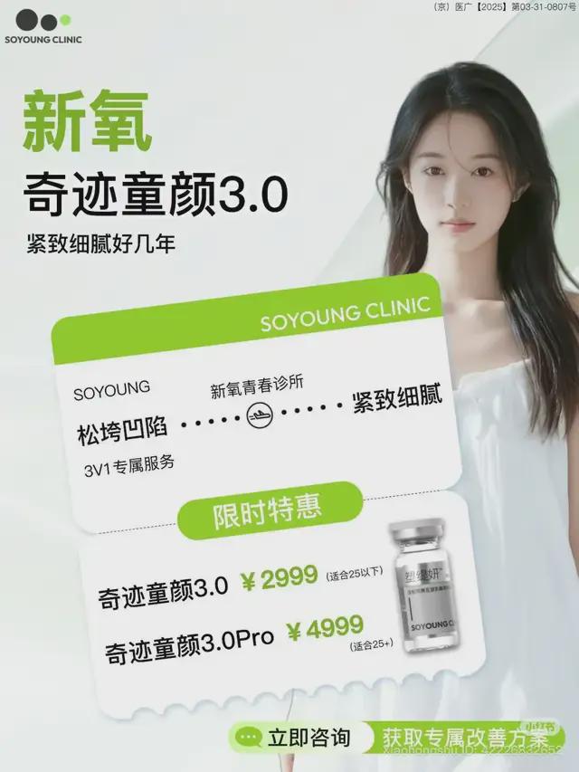 如今,作为医美平台的新氧亲自下场抢夺定价权,打破“童颜针”的高价神话。2025年9月23日,新氧推出“奇迹童颜3.0”,价格仅为2999元,可以说是国内童颜针的史上最低价。