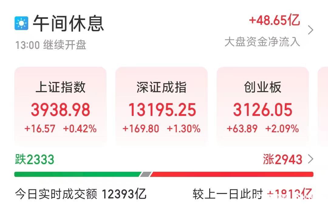 10月24日,A股三大指数早盘集体上涨,沪指创年内新高。截至午盘,上证指数报3938.98,涨0.42%,深成指报13195.25,涨1.3%,创业板指报3126.05,涨2.09%,三市半日成交额12393亿元,较上日放量1813亿元。全市场超2900只个股上涨。