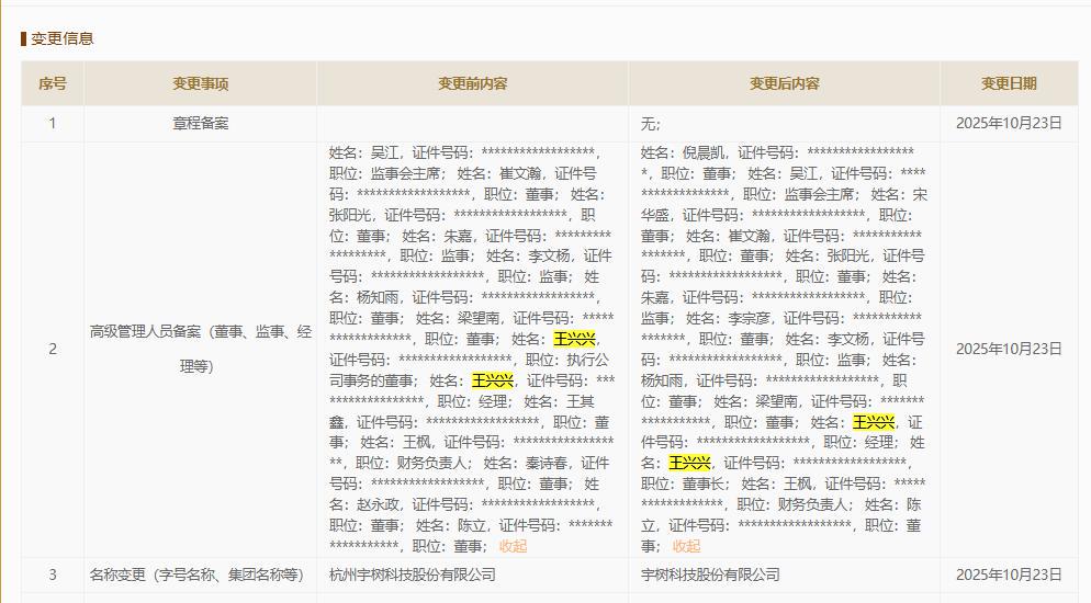 中新经纬10月24日电 国家企业信用信息公示系统网站信息显示,10月23日,宇树科技完成更名。“杭州宇树科技股份有限公司”企业名称变更为“宇树科技股份有限公司”。同时,王兴兴由执行公司事务的董事变更为董事长。