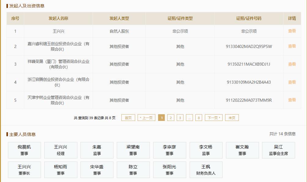 主要人员信息显示,王兴兴为董事长、总经理,倪晨凯、梁望南、杨知雨等为董事,吴江为监事会主席,王枫为财务负责人。