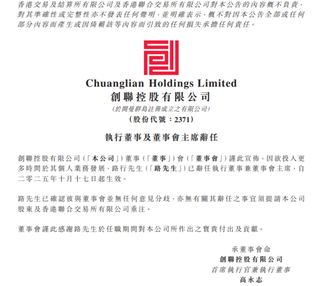10月17日,创联控股有限公司(创联控股,02371.HK)公告执行董事及董事会主席辞任。公告称,路行因欲投入更多时间于其个人业务发展,已辞任创联控股有限公司执行董事兼董事会主席,辞任自2025年10月17日起生效。