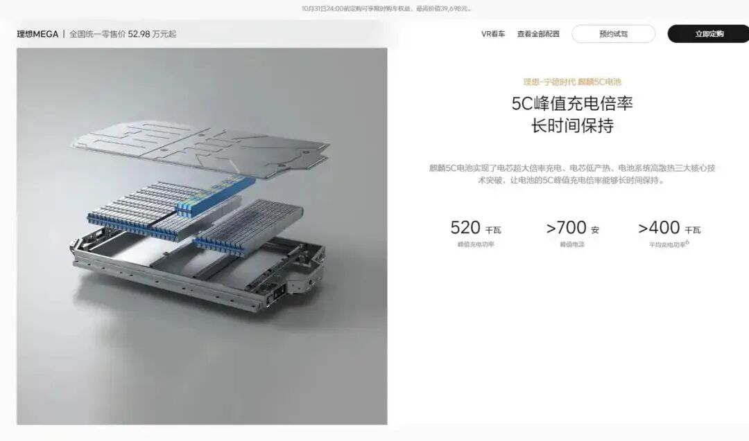 据理想汽车官网介绍,理想MEGA全国统一零售价52.98万元起,采用理想-宁德时代 麒麟5C电池。