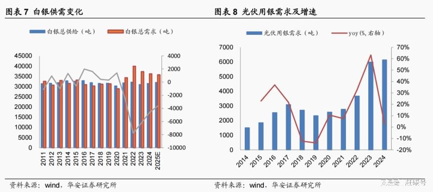 世界白银协会的数据显示,全球白银自 2021 年以来均呈现供不应求的状况,且预计2025年仍有3660 吨供需缺口。供需差主要来自光伏需求的提升,2024 年全球光伏用银量6147吨,2014至2024年间光伏用银需求量CAGR为15.09%。