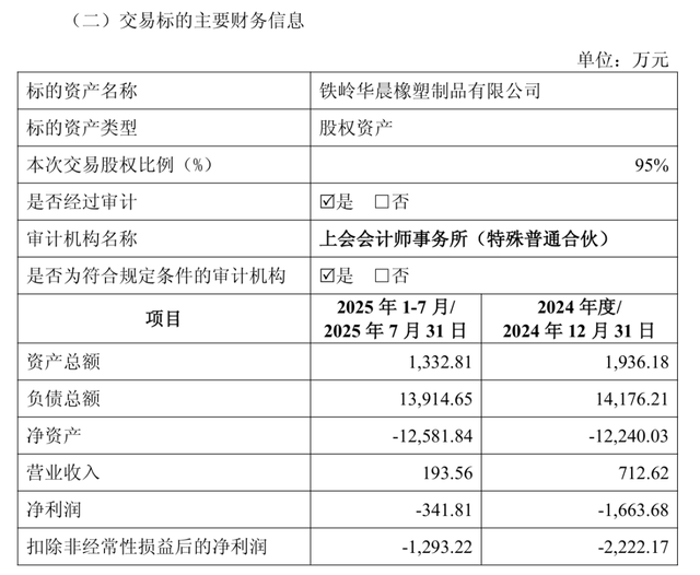 截至2025年7月31日,铁岭华晨橡塑资产总额约1332.81万元,负债总额约1.39亿元,净资产约-1.26亿元,营收193.56万元,净利润-341.81万元,扣非净利润-1293.22万元。