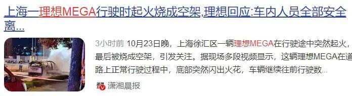 据《潇湘晨报》等多家媒体报道,10月23日深夜,上海徐汇区一辆理想MEGA在行驶途中突然起火,最终被烧成空架。