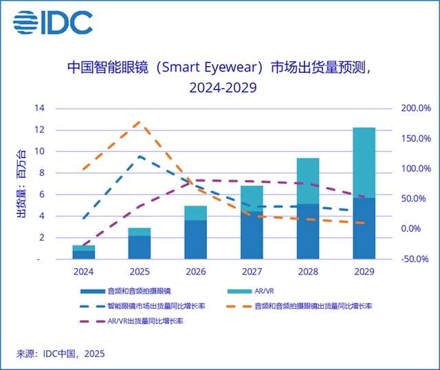 据IDC预测,中国智能眼镜2025年出货量将突破290万台,同比增幅高达121%,2025年上半年,全球智能眼镜市场出货量达406.5万台,同比增长64.2%,到2029年,全球智能眼镜市场出货量将突破4000万台;