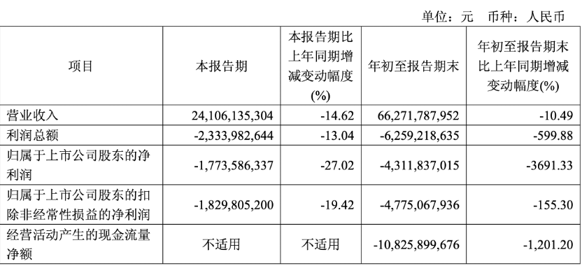 10月24日,广州汽车集团股份有限公司(广汽集团,601238)发布的2025年第三季度报告显示,公司在今年第三季度实现营业收入241.06亿元,同比下滑14.62%;归属于上市公司股东的净利润为-17.74亿元,同比下滑27.02%;基本每股收益-0.17元。